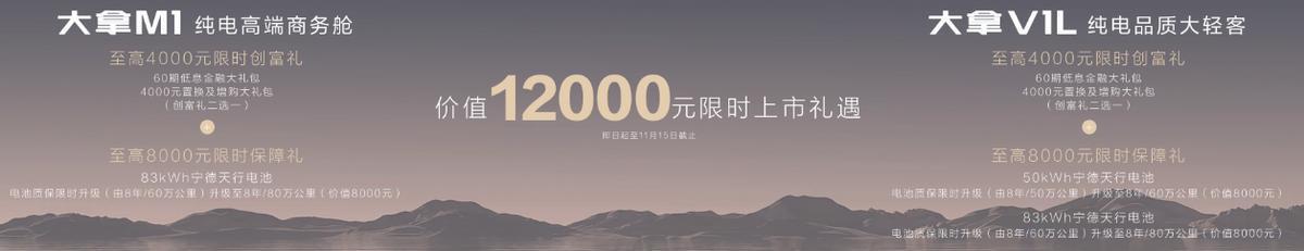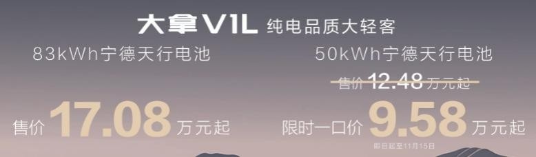 其中,纯电高端商务舱大拿M1,搭载83度宁德天行电池售价19.78万元起;纯电品质大轻客大拿V1L,83度宁德天行电池版售价17.08万元起;50度宁德天行电池版售价12.48万元起,限时一口价9.58万元起。新车上市之际,还带来价值12000元得丰厚限时上市礼遇。